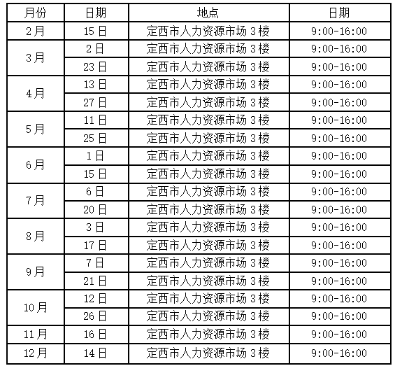 定西市人力资源和社会保障局三楼市人力资源市场(定西市安定区新城区漳县街12号)。