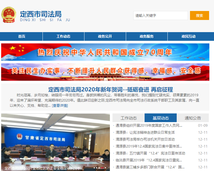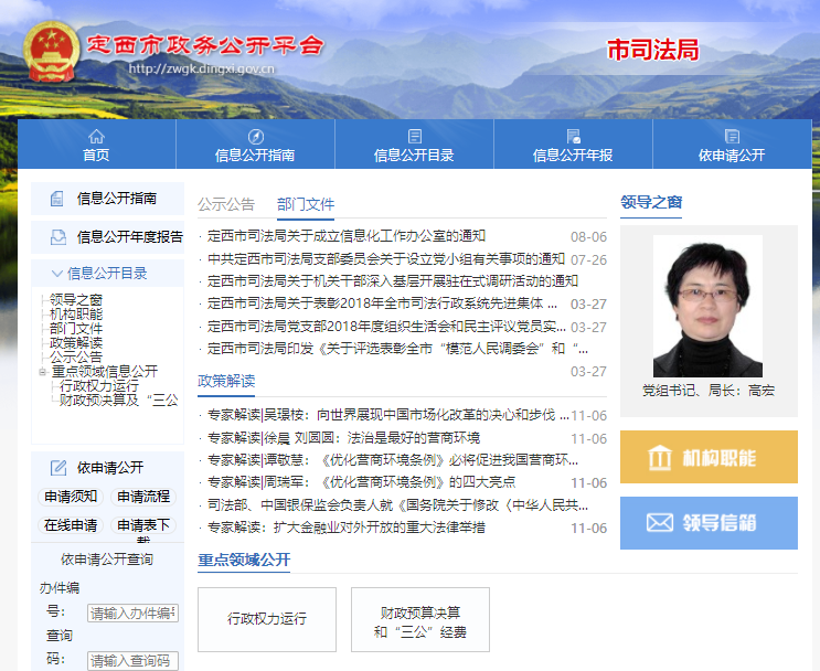 (二)优化政务公开平台功能。市司法局主动适应新时期政务公开和公共服务工作需要,进一步提高政府网站管理服务水平,平稳做好机构改革后“定西司法局”网站的整合、改版、迁移、升级等工作。强化网站管理责任,确保分工明确、责任到人。完善网站安全保障机制,切实做好防攻击、防篡改、防病毒等工作。并通过市政府政务信息公开平台,优化公开栏目,细化信息公开目录,开设了机构职能、部门文件、政策解读、公示公告、领导之窗、重点领域信息公开等6个专栏,重点做好财政预决算及“三公”经费等重点工作信息公开,并及时开展重大政策、规范性文件解读,提高市司法局行政工作透明度。