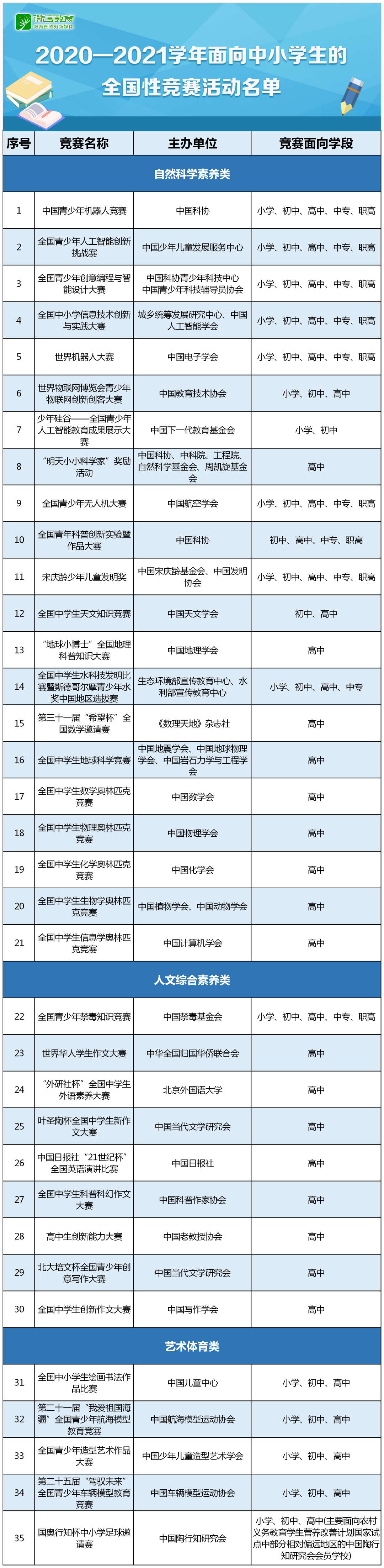 日前,教育部公布了2020-2021学年面向中小学生的全国性竞赛活动名单,名单分为“自然科学素养类”“人文综合素养类”“艺术体育类”三类,共有“中国青少年机器人竞赛”等35项竞赛进入名单。